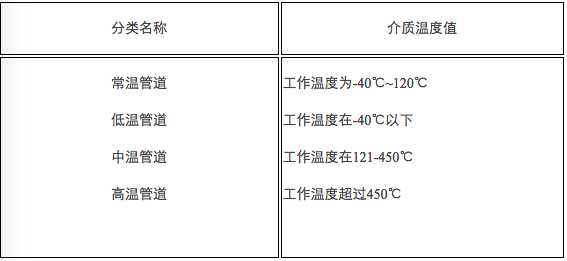 根據(jù)管道工作溫度不同分為低溫、常溫、中溫和高溫管道,其劃分標(biāo)準(zhǔn)見表1-1-8。